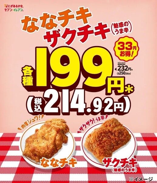 セブン-イレブンの人気ホットスナック「ななチキ」とうま辛い味付けに仕上げたやみつきフライドチキン「ザクチキ(魅惑のうま辛)」が、通常250円のところ期間中は214円で販売されます。