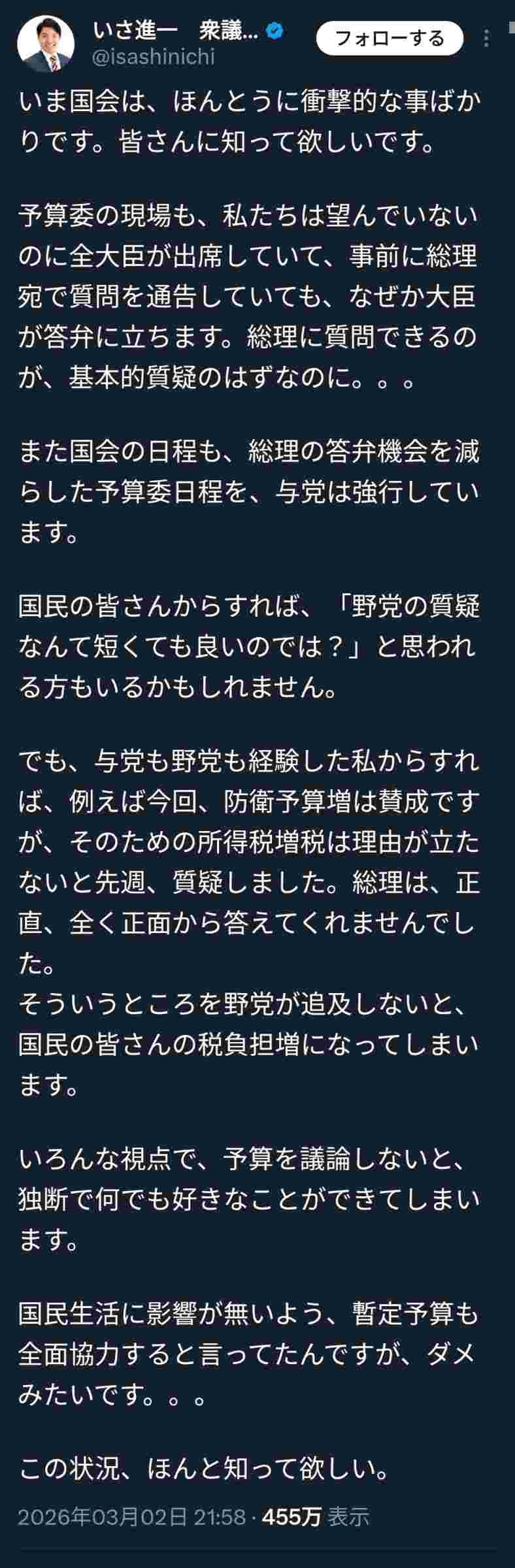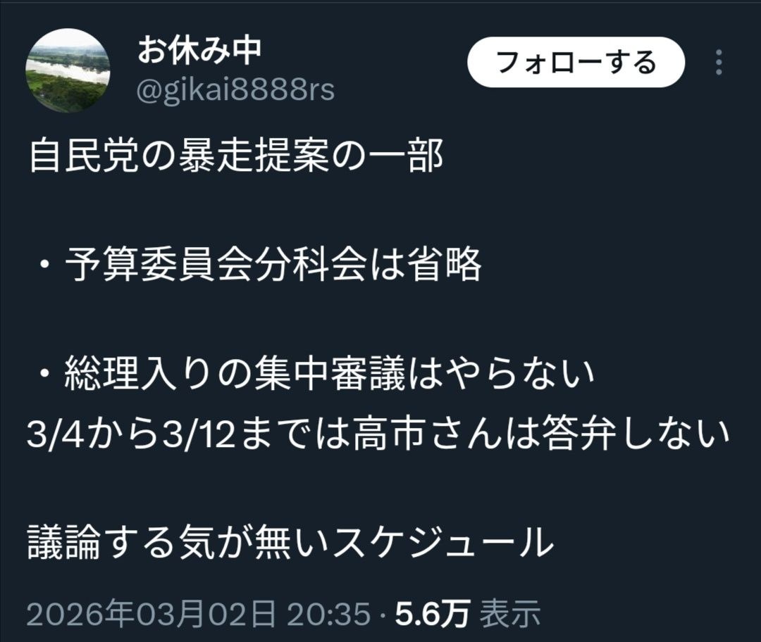 予算委員会の総理質疑がないだけやんw