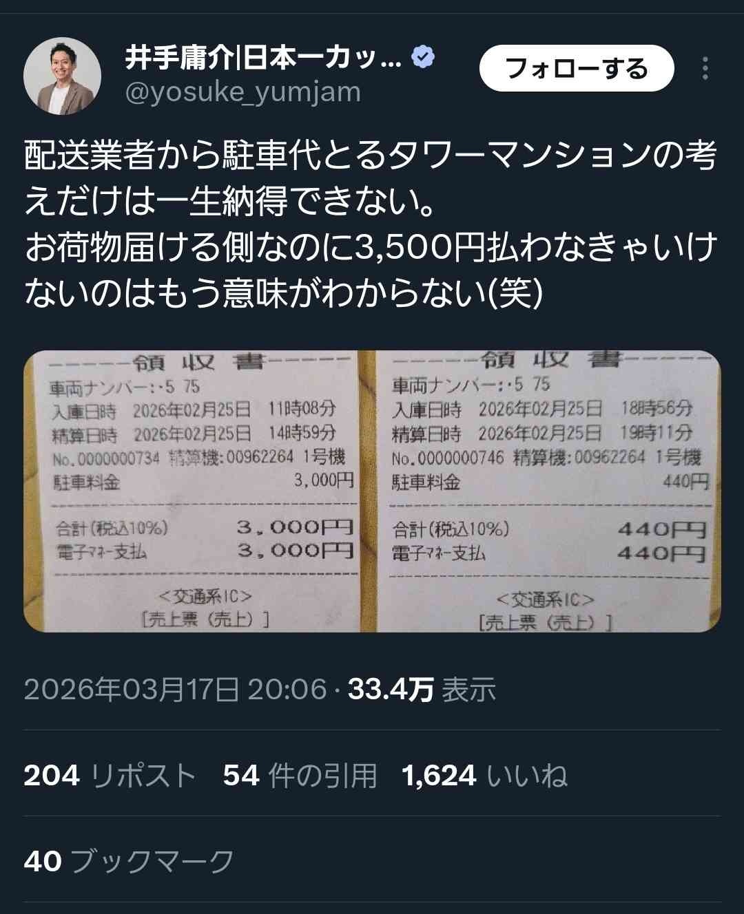 タワマンの住人が宅配使うなら配送車の駐車場代くらい払うのが筋やないか