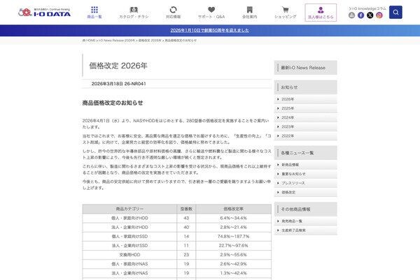 アイ・オー・データ機器は3月18日、NASやHDDなど280型番について、2026年4月1日より価格を改定することを公表した。