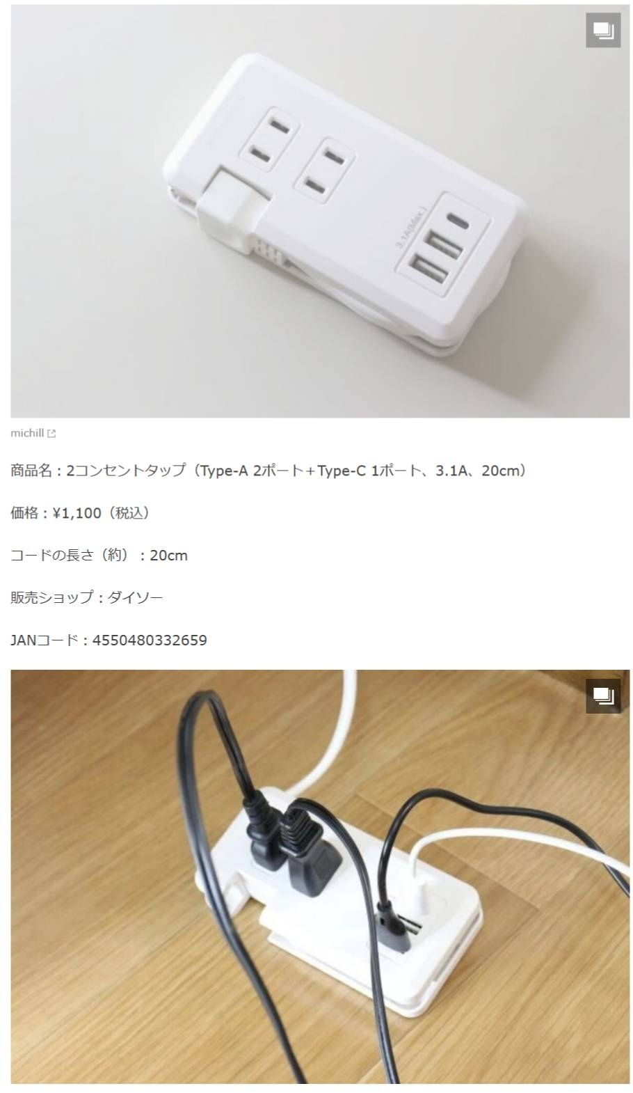 充電機器が増えてコンセント不足に悩んでいる人におすすめなのが、ダイソーの『2コンセントタップ(Type-A 2ポート+Type-C 1ポート、3.1A、20cm)』。