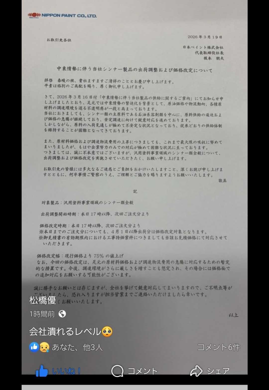 塗装する物は全て大幅値上げへ