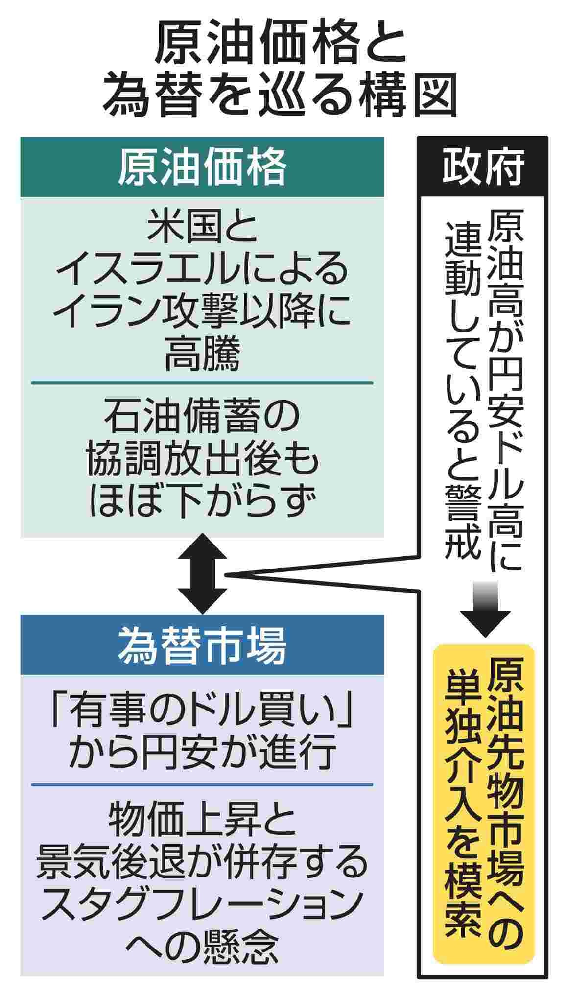 政府は、中東情勢の緊迫化に伴う原油価格の高騰に対処するため、先物市場への単独介入を模索している。原油高が外国為替市場での円安ドル高に連動しているとみており、為替介入に使う外国為替資金特別会計(外為