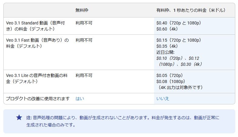 API使用料金表は以下の通り。Veo 3.1 Liteの動画1秒当たりのAPI使用料金は720pが0.05ドル(約7.97円)、1080pが0.08ドル(約12.75円)です。
