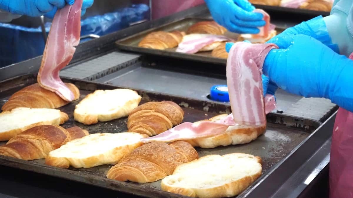 工場では、3月31日にリニューアルされた「クロワッサン ベーコンエッグ」と今月7日にリニューアルされた「サクふわメロンパン」の製造工程をメディア向けに公開。手作業で具材を挟んだり、味付けをする作業やパンが焼けていく様子が披露された。