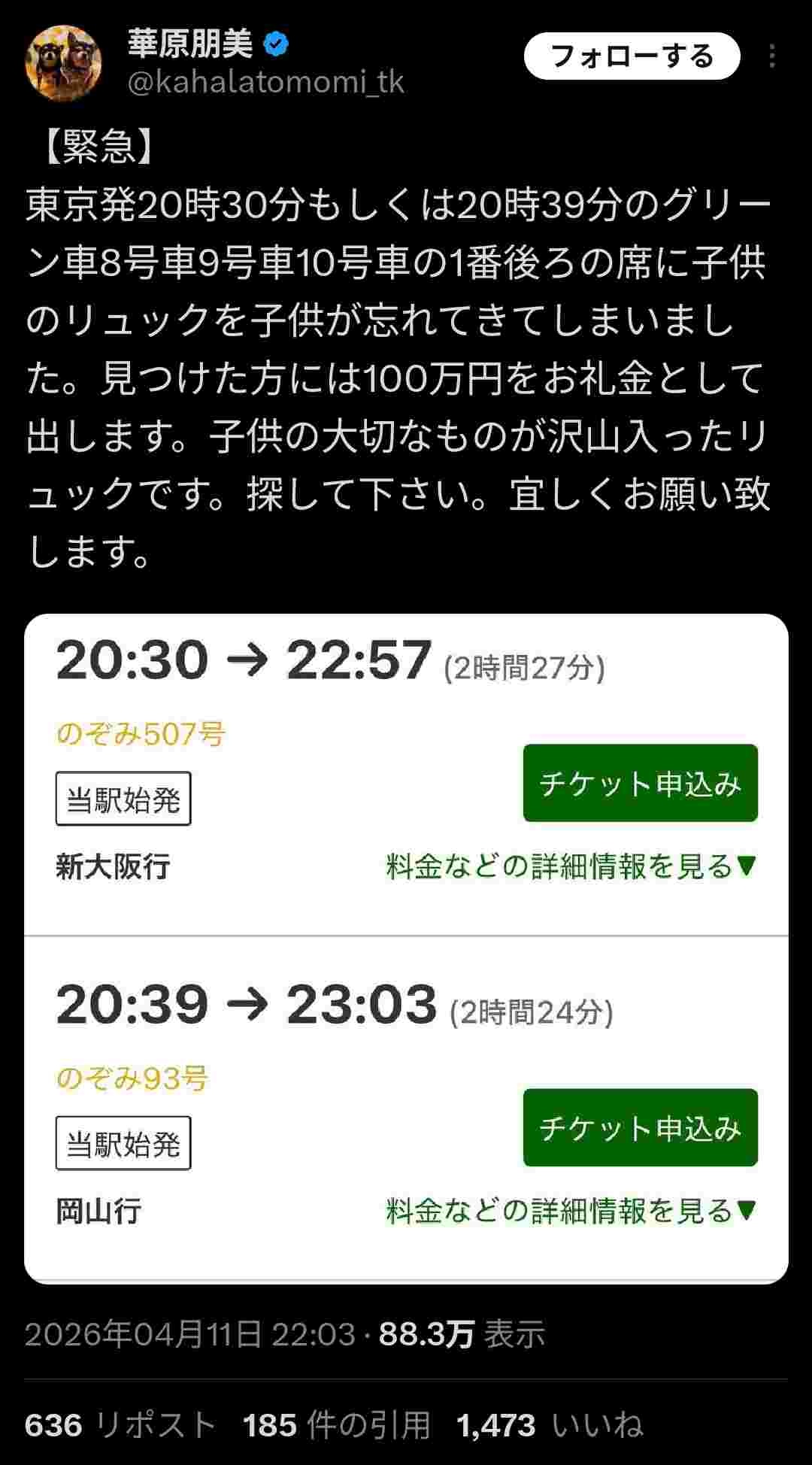 グリーン車で子供用のリュックなんて誰も盗まないと思うが届いてないの?