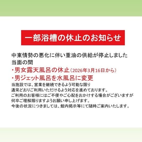 中東情勢の悪化受け温浴施設の露天風呂を一部閉鎖「安定した営業ができない」