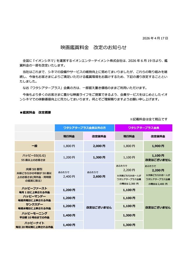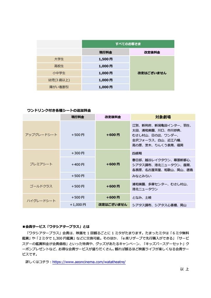 イオンシネマ、値上げ