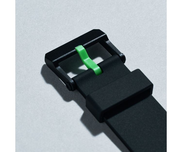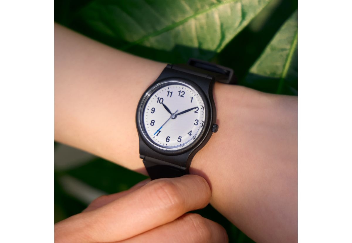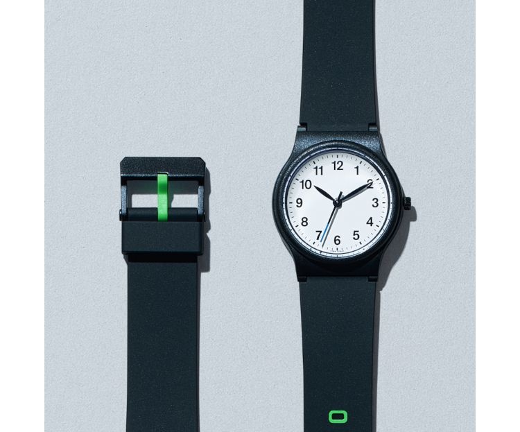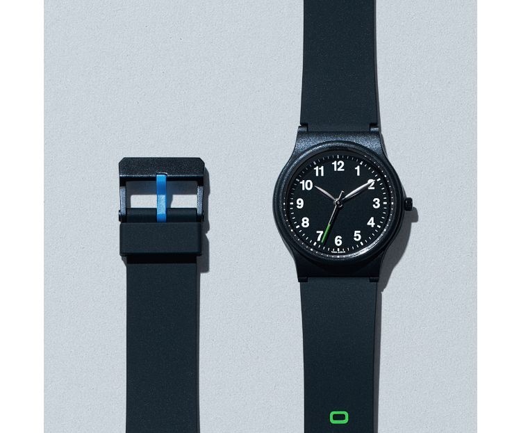 シチズン時計と共同開発した腕時計。水泳時も着用可能な10気圧防水で、子供から大人まで使えるサイズだという。秒針・ベルト穴・つく棒にはファミリーマートカラーをあしらった。