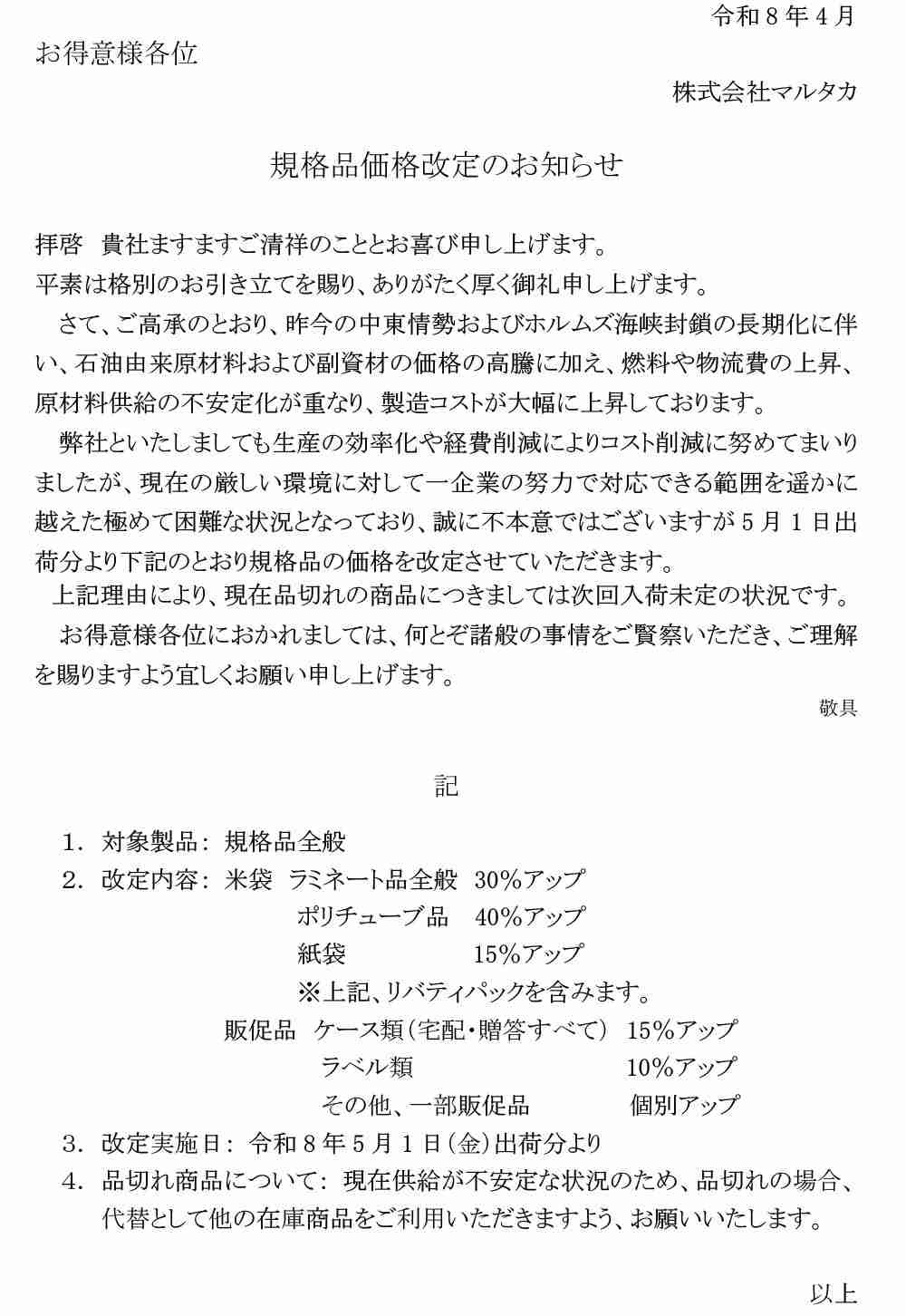 規格品価格改定のお知らせ
