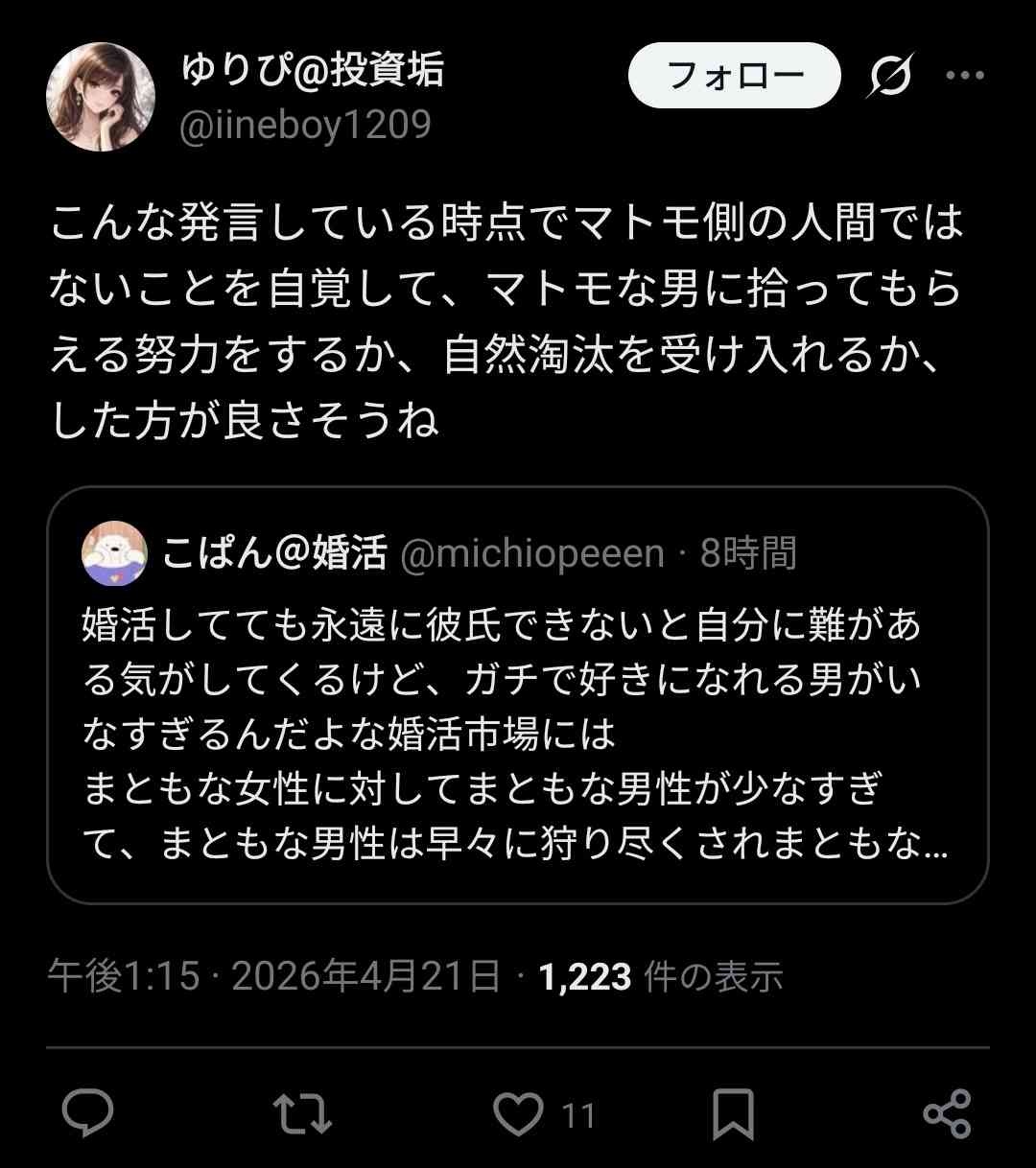 婚活市場にも恋愛市場にも居場所がない俺みたいのがパージされてるんだもん