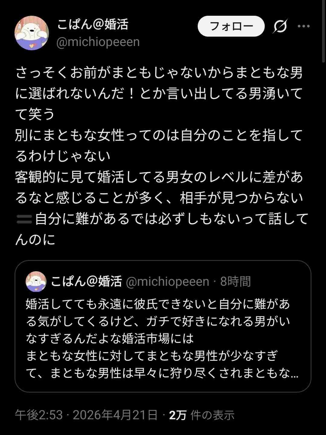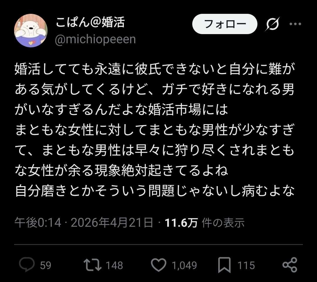 あわよくば男しかいないから、女にとって婚活はクソゲーなのは事実だよ