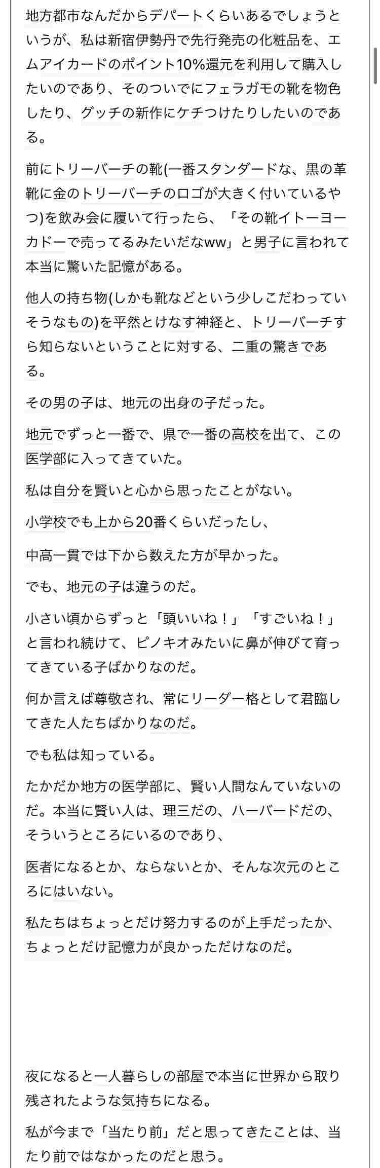 ・「たかだか地方の医学部に賢い人間はいないのだ」と言いつつ自分もそのレベルなのにみんなを見下してる(私は自分を賢いと思った事ないが~と保険をかけつつ)