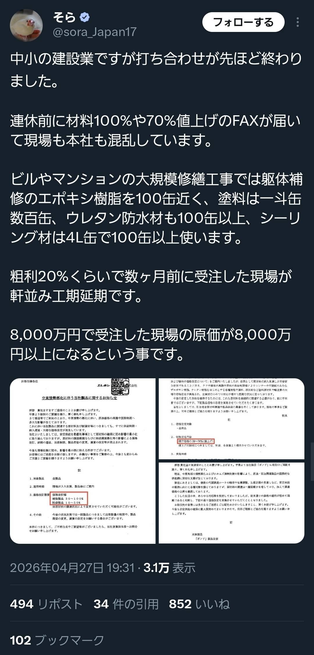 これ、上昇分を価格に転嫁できる契約じゃないと業者潰れちゃうね
