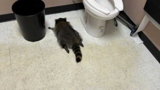 嫌儲アライグマが酒店に侵入。棚をあらし酔っ払ってトイレで爆睡