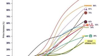嫌儲米政府発表インフレ率、2014年→2024年で31%👉価格上昇率についてマクド100% タコベル81% サブウェイとスタバ39%