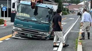 嫌儲広島県廿日市 道路陥没で一時通行止め トラックのタイヤが穴にハマる