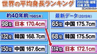 嫌儲日本人の平均身長40年で2cmしか伸びず、中国韓国は7cm以上伸びて逆転される マジで原因なんなのこれ
